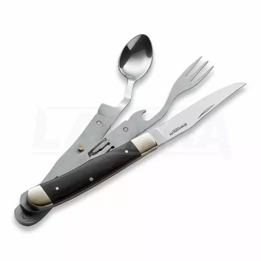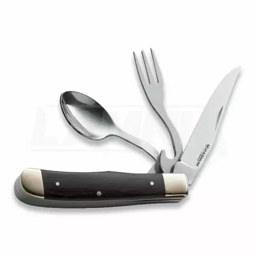 A compact and fully fledged camping cutlery set. Knife, fork and spoon are made of 440 steel and are separated from each other thanks to the use of an innovative fastener technology. Brass-coloured bolsters in combination with the dark brown laminated wooden handles complete the overall package.