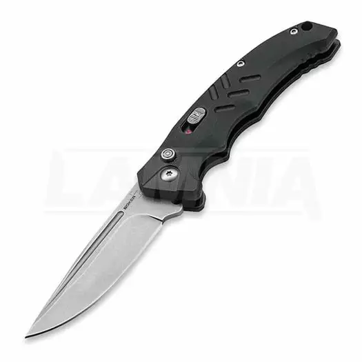 Designed as a tactical automatic knife, the Böker Plus Intention is not only convincing in the field, but also copes effortlessly with all the cutting tasks that arise in everyday life. Pressing the push button releases the dark stonewash blade made of D2, by the tension of the spring behind it, it then flips open automatically. A clean latching slide lock further secures the knife against accidental release. The ergonomically shaped handle is made of textured G10, ribbing in the area of the thumb rest and the pronounced finger recess further improve the hand position. With lanyard loop and clip (tip-down).