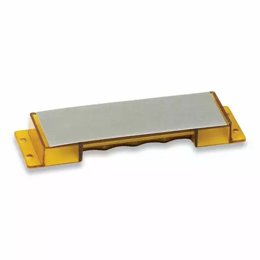Measures 187 mm x 64 mm x 19 mm. 100% diamond coated surface. Coarse 325 grit. Single side. Translucent yellow composition housing with pre-drilled holes for mounting. Clear housing cover with Buck logo.