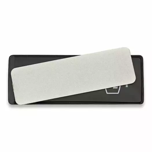 Measures 102 mm x 32 mm. 100% diamond coated surface. One side is 325 coarse grit, the other 750 medium grit. Black plastic storage sleeve with Buck logo.