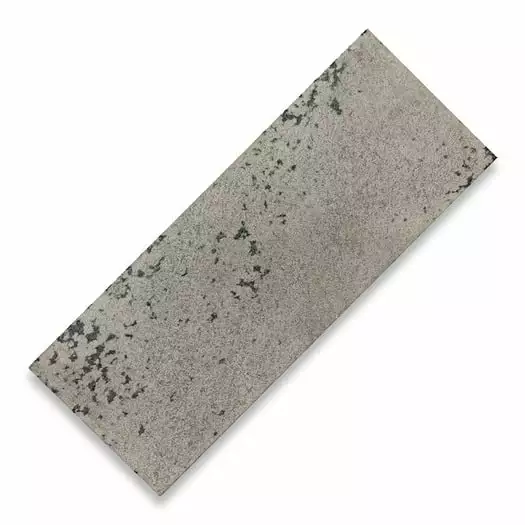 Measures 114 mm x 38 mm x 6 mm. Soft Arkansas stone. Black nylon belt sheath.