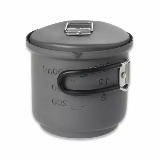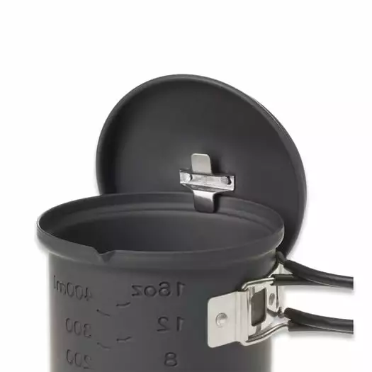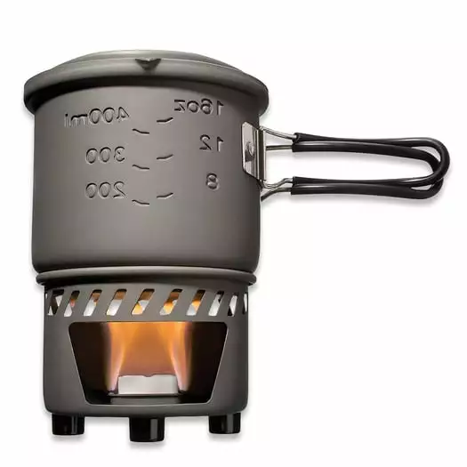 Hard anodized aluminum construction. Measures approximately 5 7/8″ x 4 1/8″ when assembled. 19 1/2 oz. cooking pot with volume indicator markings on the inside and collapsible hinged handles with black silicone grips. Wind deflector stores inside pot for easy storage. Uses Esbit solid fuel (not included). Black drawstring mesh bag included.