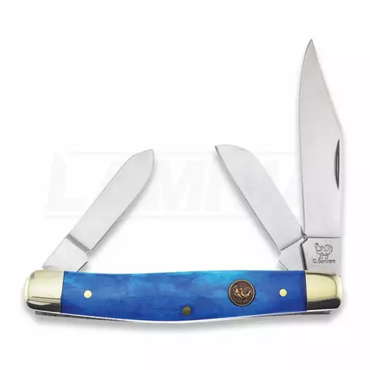 4″ (10.16cm) closed. Mirror finish stainless clip, sheepsfoot, and spey blades. Blue smooth bone handle. Nickel silver bolster(s). Inlay shield.