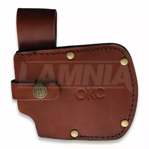 305 mm overall. 108 mm black powder coated carbon steel axe head with 76 mm cutting edge. Gray canvas micarta handle. Full, extended tang. Lanyard hole. Brown leather belt sheath.