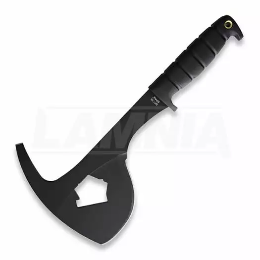SP-16 SPAX. 330 mm overall. 127 mm cutting edge. 178 mm black powder coated 5160 carbon steel axe head. Black grooved rubber handle. Lanyard hole. Black nylon belt sheath.