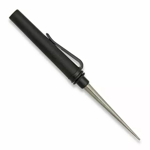 4 3/4″ closed with 3″ diamond coated sharpening rod. Black plastic handle. Pocket clip.
