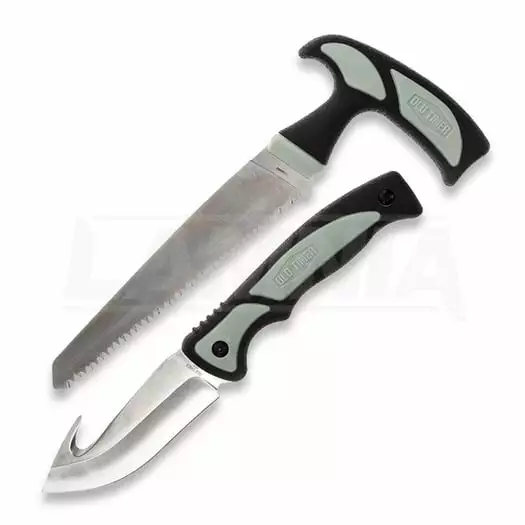 9″ (22.86cm) overall. 3.75″ (9.53cm) satin finish 8Cr13MoV stainless guthook blade. Black and gray TPE handle. Full tang. Includes 8.5″ overall saw with 6″ serrated blade. Black nylon belt sheath.