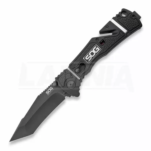 The Trident Elite features SOG’s patented Assisted Technology for quick one-handed opening. The slot cutter built into the handle can cut thin rope, belts, or webbing without opening the blade. The front of the handle has a built-in glass breaker for any situation. The Trident Elite comes with a 3.7-inch blade made of reliable AUS-8 stainless steel and a durable glass-reinforced nylon handle with textured rubber inserts to improve grip.
