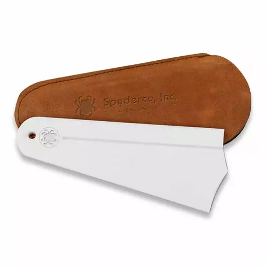 Spyderco’s Golden Stone sharpening device is all curves and angles for sharpening any edge. U.S.A. Made, from Alumina Ceramic, it’s created through a process combining a bonding agent with alumina particles (that are actually synthetic sapphires 15 to 25 microns in size). It is then kiln fired at temperatures exceeding 3000 degrees F (1649-C) where it reaches 9 (out of 10) on a Mohs hardness scale and is cooled in stages.