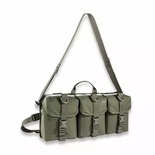 Bag divided into three parts that is attached to the front seat of the vehicle. The bag can be used as a bandolier system. It can be quickly removed from the vehicle by the handle. Part of the TacVec series.