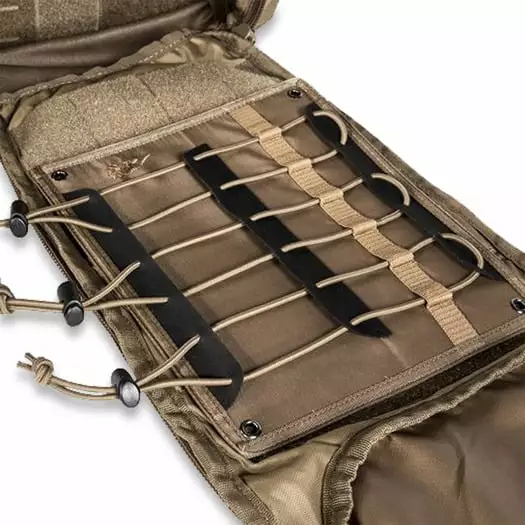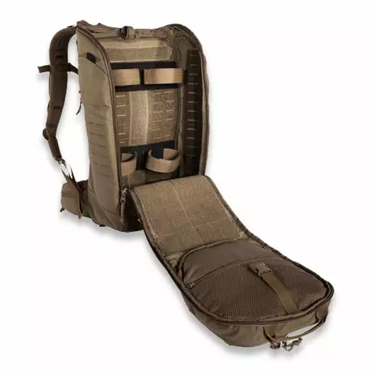 Modular universal combat backpack. The backpack has a lid pocket and laser-cut MOLLE on the sides and front. The front opening of the backpack pulls up completely. The insides have Velcro sections for individual features. The hip fins are detachable. Comes with three Velcro accessories pouches and a Velcro weapon holster.